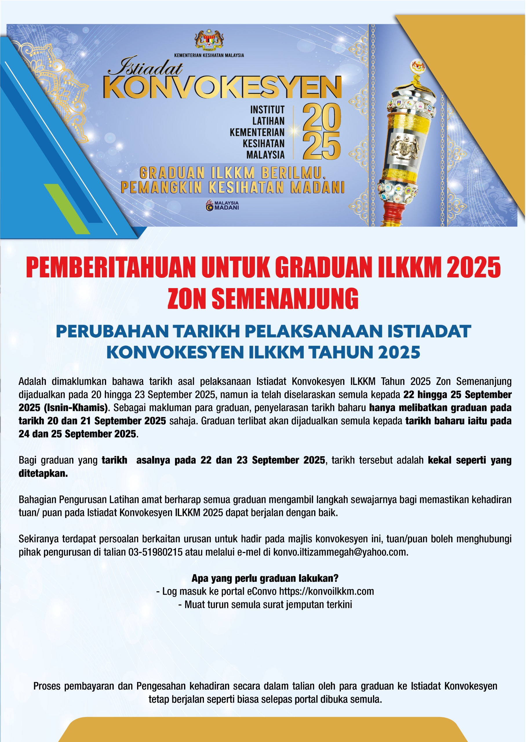 Bahagian Pengurusan Latihan Kementerian Kesihatan Malaysia mengucapkan tahniah dan syabas kepada semua graduan yang telah berjaya menamatkan pengajian. Majlis Konvokesyen Institut Latihan Kementerian Kesihatan Malaysia (ILKKM) 2025 akan diadakan di: